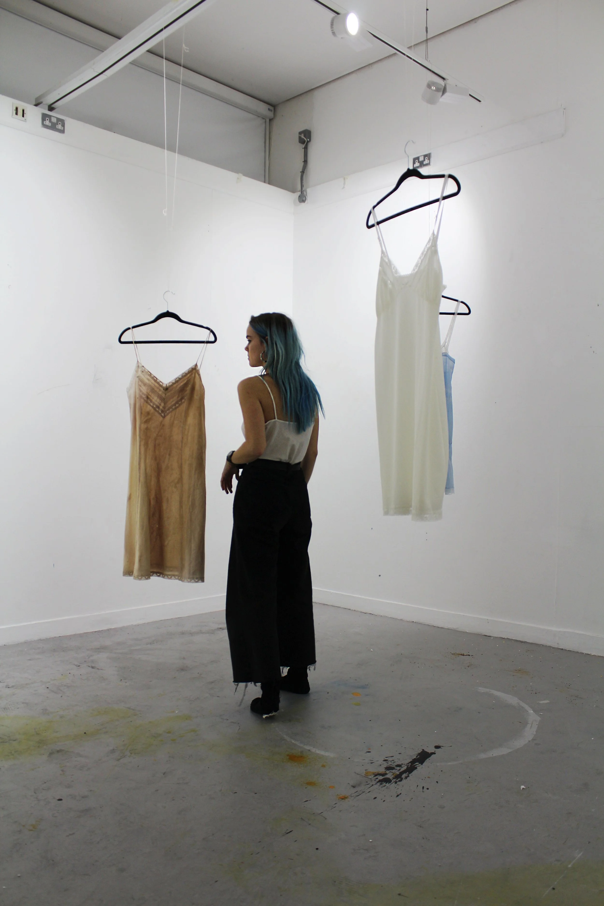 This piece is part of my Victim to Victor project, where I explored healing through various mediums, inspired by Kintsugi—the Japanese art of mending with gold. My work involved actions like dipping dresses in plaster and punching them to symbolise abuse, then attempting to repair them with gold thread and beads. In a performance inspired by Marina Abramović, I stood still while participants threw liquids—wine, coffee, tea, beer—at me, staining my dress and symbolising the lasting effects of trauma. I also allowed them to cut the dress, then healed these wounds with gold thread.