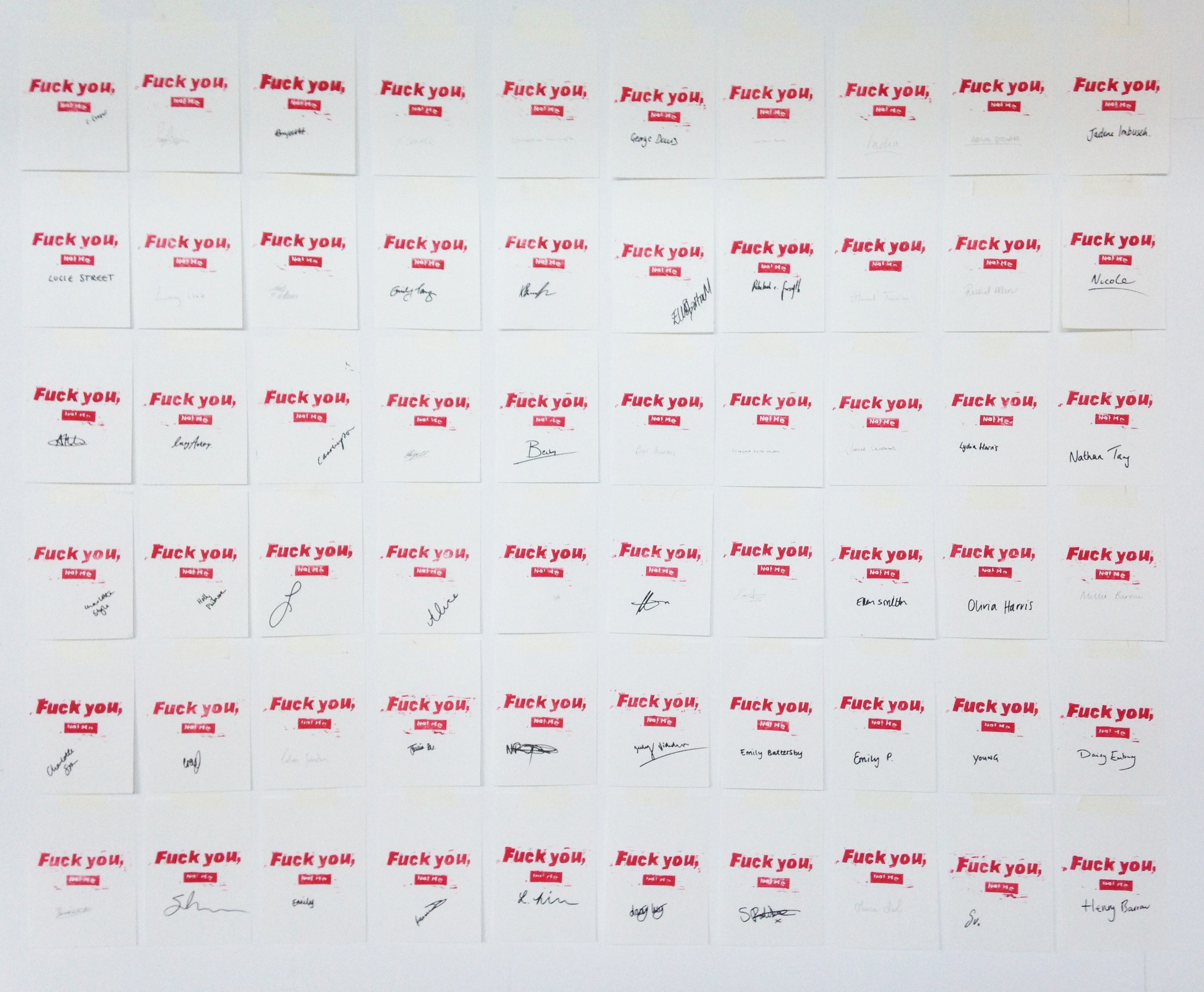 By creating 60 lino prints with the phrase "Fuck you, not me," the project became a protest against the censorship of survivors’ voices, particularly those who have experienced sexual violence. I envisioned it evolving into a national campaign that would challenge censorship in public spaces